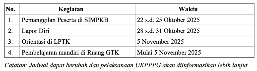 Adapun untuk Jadwal Pelaksanaan dan Lapor Diri PPG Guru Tertentu tahap 4 tahun 2025 di Universitas Muhammadiyah Palangkaraya adalah sebagai berikut: